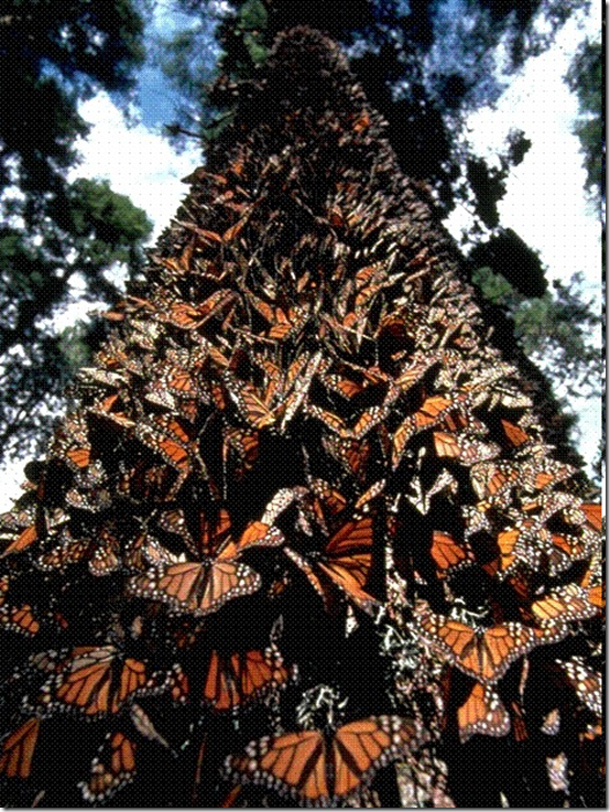 Monarch butterflies embark on a marvelous migratory phenomenon. They travel between 1,200 and 2,800 miles or more from the United States and Canada to central Mexican forests. There the butterflies hibernate in the mountain forests, where a less extreme climate provides them a better chance to survive. While Monarchs may not be on the endangered list yet, deforestation, global warming, and loss of milkweed, which Monarchs need to survive as larva, threaten their survival.